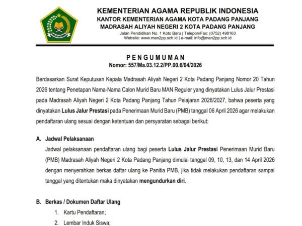Berdasarkan Surat Keputusan Kepala Madrasah Aliyah Negeri 2 Kota Padang Panjang Nomor 20 Tahun 2026 tentang Penetapan Nama-Nama Calon Murid Baru MAN Reguler yang dinyatakan Lulus Jalur Tes pada Madrasah Aliyah Negeri 2 Kota Padang Panjang Tahun Pelajaran 2026/2027, bahwa peserta yang dinyatakan Lulus Jalur Tes pada Penerimaan Murid Baru (PMB) tanggal 06 April 2026 agar melakukan pendaftaran ulang sesuai dengan ketentuan dan persyaratan sebagai berikut: